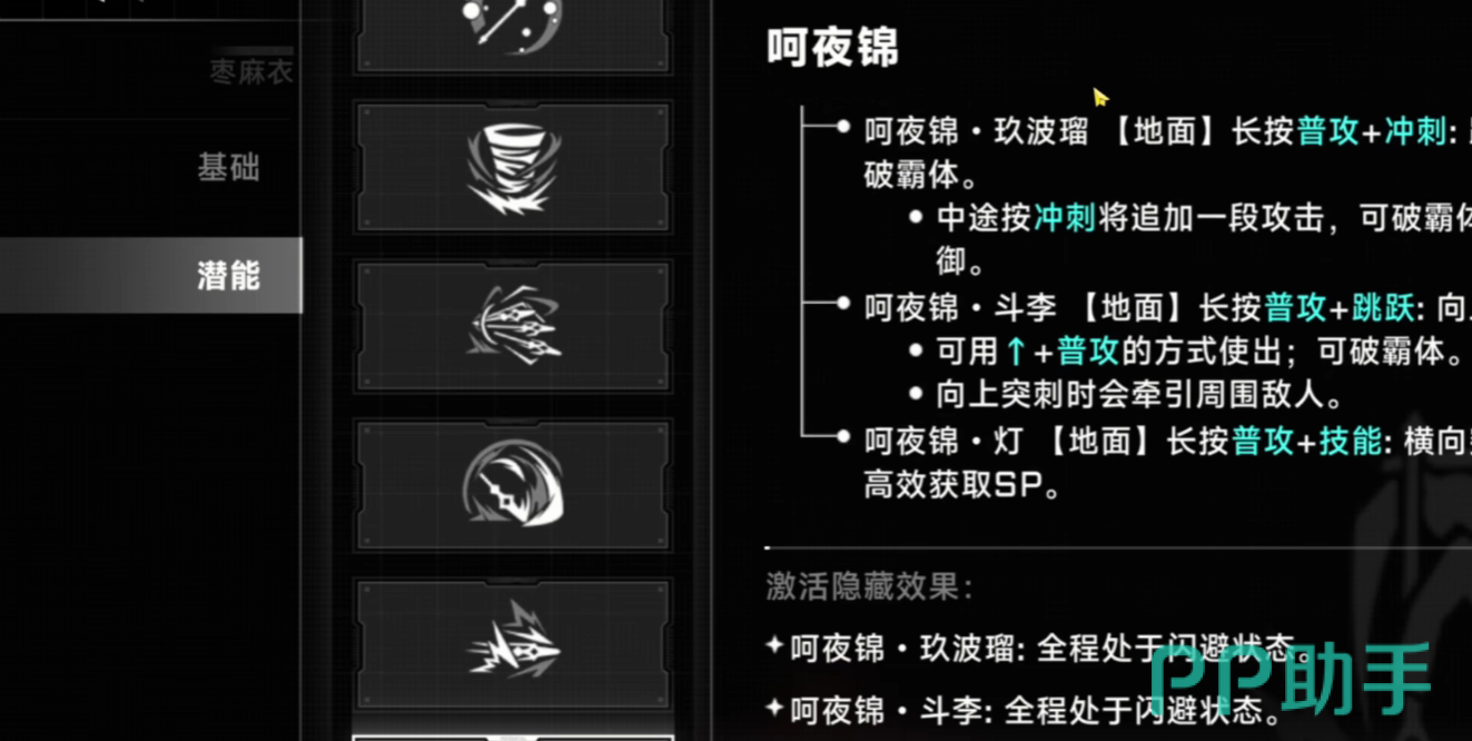 枣麻衣在游戏内总共有两个特殊技能,第一个技能是呵夜锦,当玩家长按普通攻击键和冲刺键的时候,枣麻衣会被附加破甲buff,此时她会向前冲击一段时间,并且可以击破敌人的霸体状态,当枣麻衣将普通攻击键和跳跃键合并在一起时,可以突破上方目标的霸体状态,该技能对于护甲比较高的敌人而言有较大的威慑力。