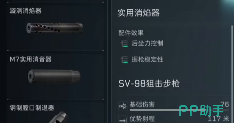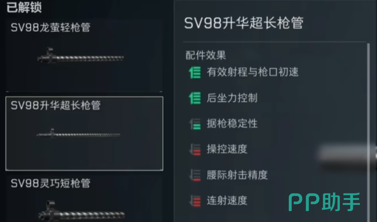 由于sv98是一把狙击步枪,因此小伙伴们在改装的时候最需要考虑的问题就是它的射程、后座控制和据枪稳定性。因此在枪管这一部分,小编为大家推荐的是sv98升华超长枪管。这个枪管可以完美地兼顾到以上,这三个方面是后座力的控制更加稳定,并且在一定程度上提高据枪的稳定性,同时也能大大的延长这把武器的射程。在装配上这个部件之后,可以说基本规避掉了这把武器的短板,并且进一步的提高了它在战斗中的实用性。