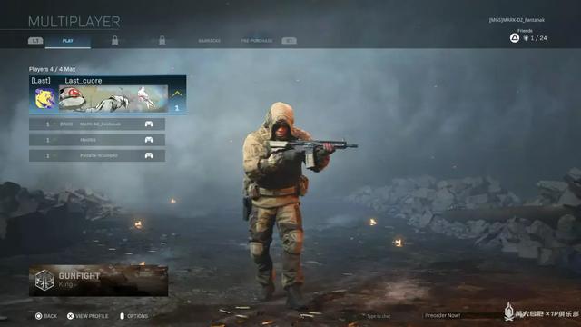 这一个玩法我印像中是没在试玩视频里呈现过的,后边再推荐它的详细模式。这次A测许多人对决,只对外开放了Play、Barracks和Pre-purchase选择项。Options能够调出设置;三角键是挚友列表,往后能够邀请好友加进对局或你加进他的对局;这儿PS4手柄中央面板长按能够启动笔墨交流页面,可选择队伍和全员交流,别的就没啥了。
