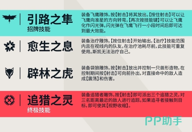 斯凯的愈生之息能力让她能够装备治疗雕饰,通过按住射击键来输出治疗能量,为技能范围内且在视线内的队友提供持续的治疗,这个技能在治疗池耗尽之前可以重复使用,但需要注意的是,斯凯无法治疗自己,除了愈生之息外,斯凯还拥有一个名为辟林之虎的技能,使用的时候她可以装备袋狼雕饰,然后按射击键放出并控制一只兽形造物,在控制期间,她可以再次按射击键让兽形造物向前扑出,对直接命中的敌人造成震荡和伤害。