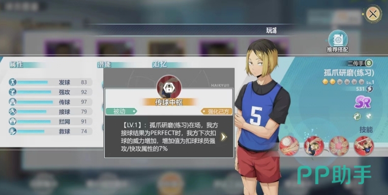 其次孤爪研磨的传球中枢技能也是一大亮点,这个技能就是他的一个核心技能,当孤爪研磨在场且己方接球结果为完美判定时,己方阵容下次扣球的威力将会增加,这一技能不仅能够提升球队的进攻能力,还能让队伍成员达成高质量的接球,从而直接转化为更强大的进攻,因此在比赛中,玩家可以在接球环节力求完美,提升整队的得分数值。