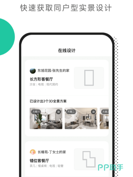 软件拥有全面的家装服务,支持在线量尺、参考设计素材、参考设计干货、咨询交流等,即使是奇葩户型也能找到合适的方案,并且支持生成3D户型效果图让用户进行全方位的查看。