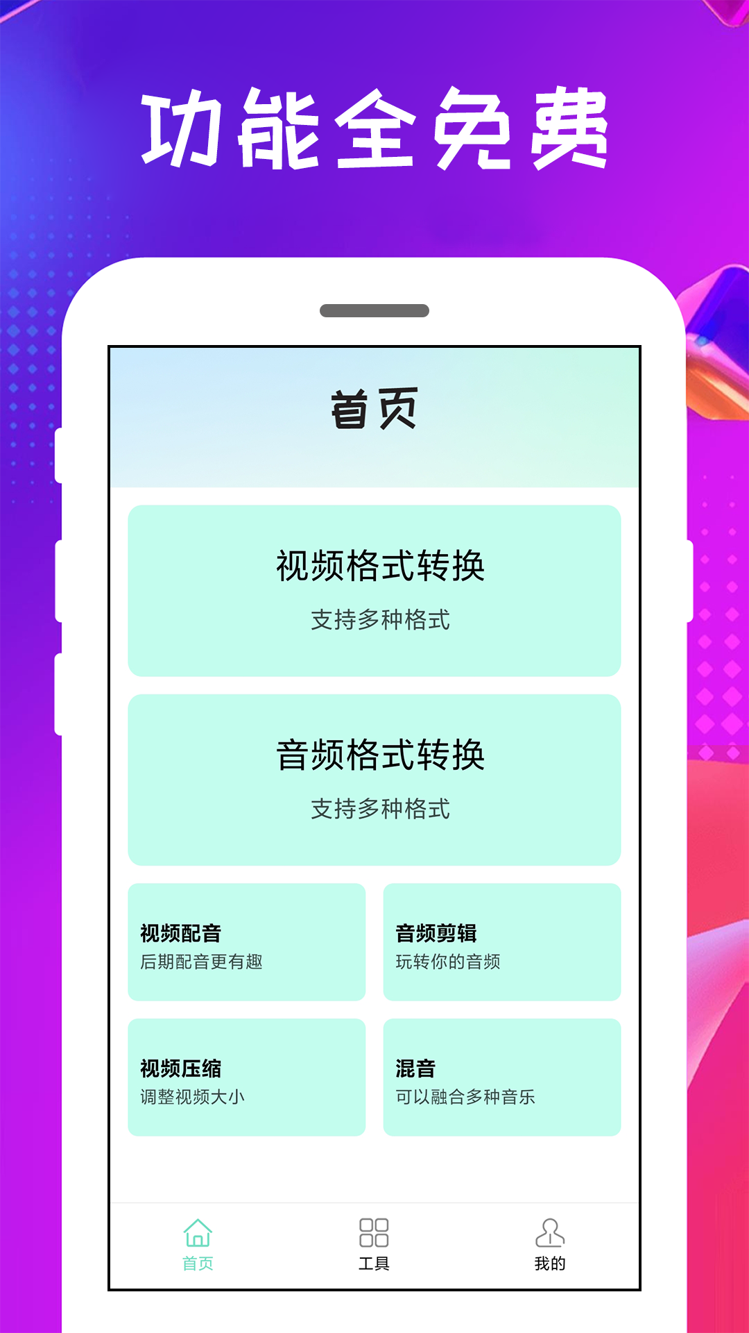 傻瓜式格式转换工具箱,各种功能一目了然,用户们直接选择对应的按钮,实时格式切换,打破了水印、文件格式等限制。在格式转换的同时,它还能进行视频和音频编辑,自由分解出文件的某一部分。
