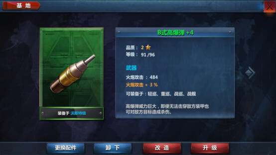 在舰船页面,当前人物选择配件,可以查看配件的详细信息,也可以通过更改配件按钮进行重新选择配件,还可以通过卸下按钮消除此战机与配件的关联关系,还可以通过改造和升级升级当前的配件,增加他的属性信息和等级。