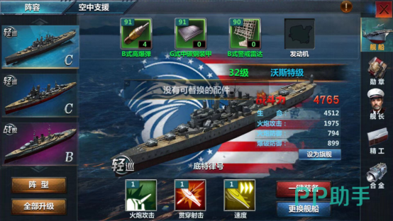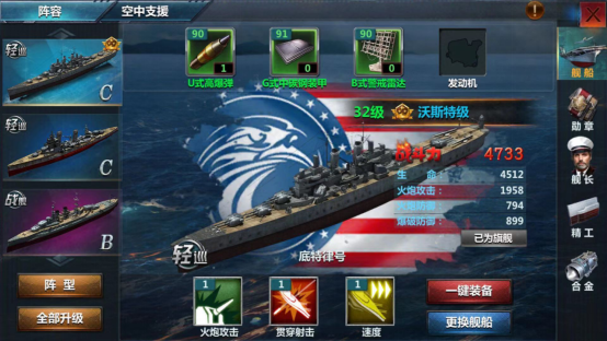 回到阵容页面后,当前人物可以选择不同的战机进行上阵,还可以选择不同的战舰进行上阵,当选择的战舰满了之后,可以选择界面中的更换舰船按钮进行选择舰船进行出战,当前人物还可以选择一键装备按钮进行升级当前选定的战舰和战舰相关联的配件属性。