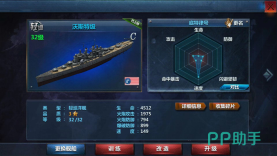 当前人物还可以通过点击战机头像进入明星信息,可以查看他的详细信息,还可以通过界面显示出图片观看他的具体属性对比,还可以通过更改舰船按钮进行重新选择战机上阵,点击训练按钮进行训练当前战机的属性值,还可以通过改造和升级按钮进行升级战机的各项属性和等级。