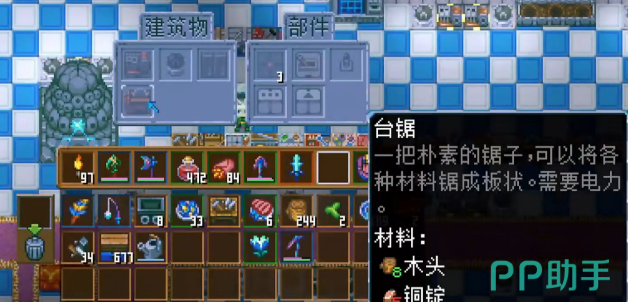 接下来,在电器桌上你可以制作一个台锯。台锯是将木材加工成木板的核心工具。当台锯制作完成后,只需将获取的木材放入台锯中,并保证其通电,台锯便会自动将木材切割成木板。