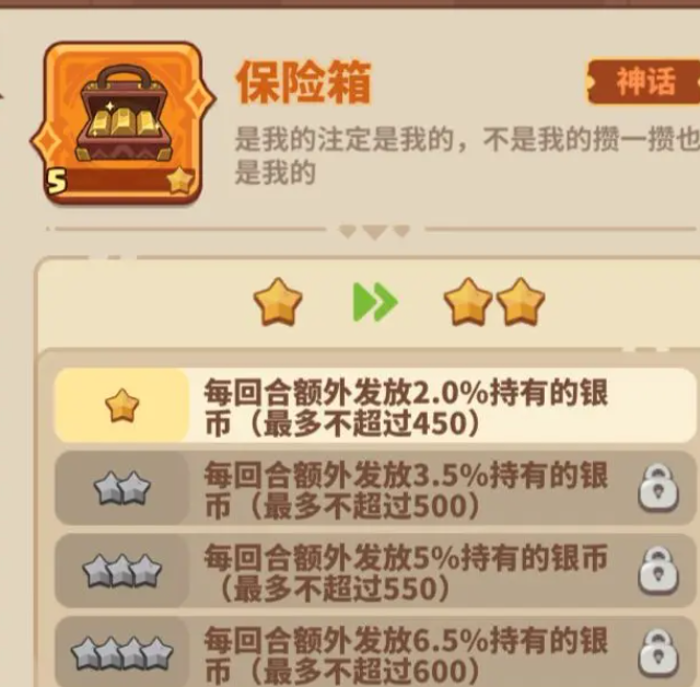 随着星级的提升,每升一颗星,保险箱就可以在回合中额外发放多于上一星1.5%的银币,这就代表着保险箱的等级越高,在游戏对战的过程中能获得的银币数量也就越多,并且这是基于玩家原有银币数量,意思就是说玩家手里的银币越多,下一回合能够获得的数量也就越多。
