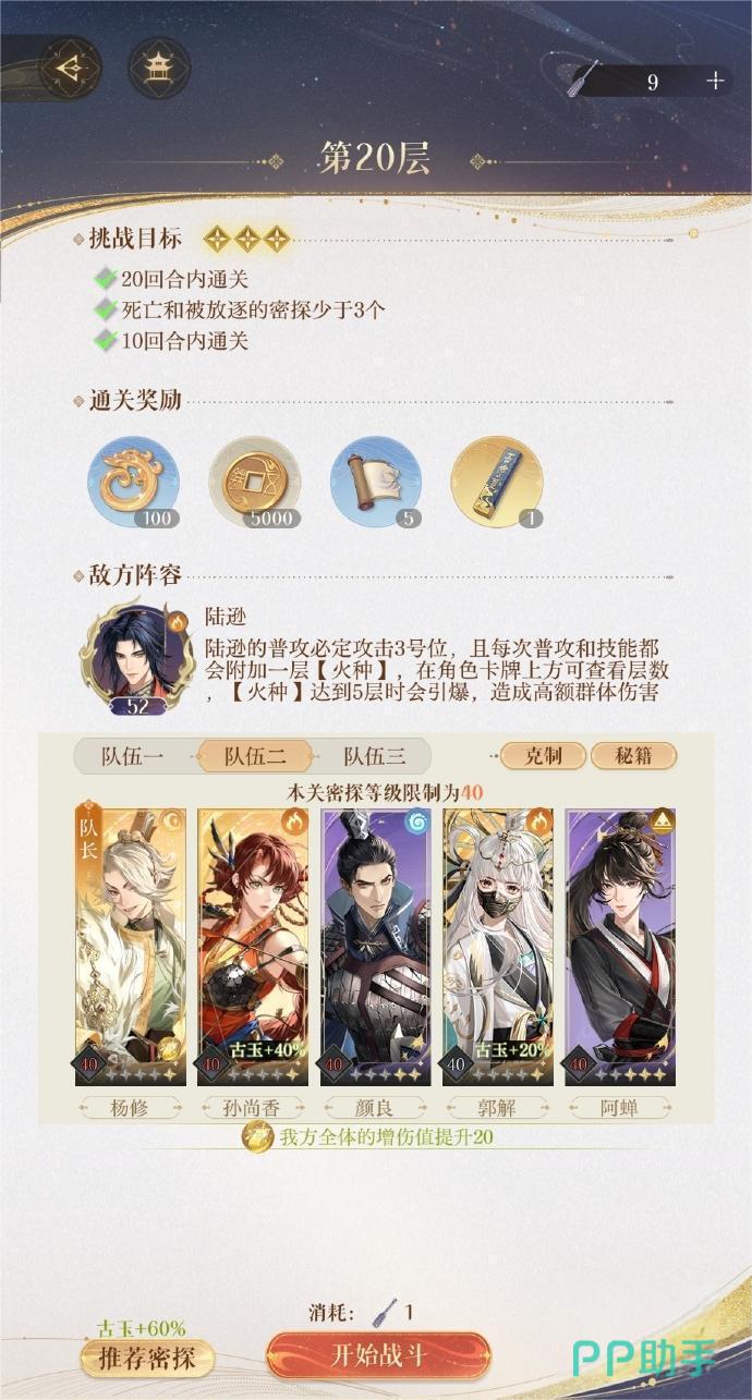 地宫20层三星通关要求是十回合内通过,死亡或者被放逐的密探少于三个。通关20层的奖励有100个古玉和秘籍还有队长徽章,三星通关后还有几率获得扫荡券。所面对的敌方boss是52级火属性的陆逊,他的技能是普攻时必攻击3号位,每次攻击都会叠加一层火种,叠加到第5层火种之后会引爆,造成高额伤害。