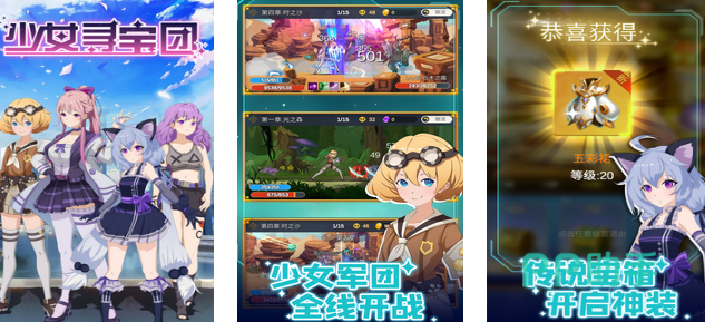 相较于其他多数量的美女游戏,玩家在少女寻宝团中主要培养四位身怀不同技能的美少女。技能除了近战和远攻,还有两位美少女拥有光明和黑暗的力量。地图的选择较为丰富,玩家可前往迷雾森林和天空之城等多个主题进行军团开战,获得宝箱就可以开启并获得神装。