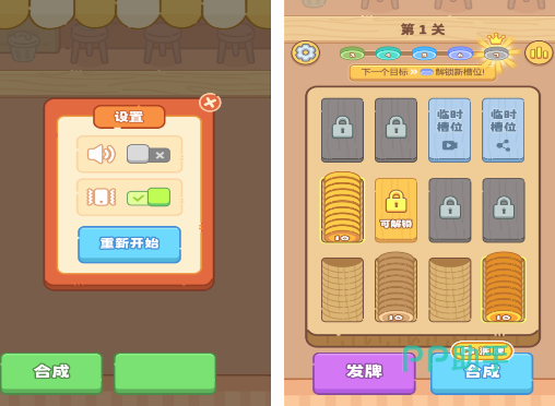 这是以硬币为主的消除游戏,可以看到各种颜色的硬币,主要的玩法就是将相同颜色的筹码放在一个盒子里面,就能帮助消除,也能在装满的过程当中合并成新的数字,需要玩家有很好的智力,在拼的过程中看玩家能够拼出多大的数字。在进入游戏以后,玩家就可以通过不断闯关的方式进行合成,还能点击重新开始。