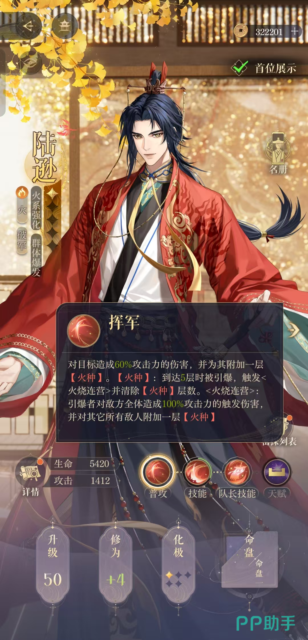 陆逊的技能“夷陵火”会消耗四点能量,可以对全体敌人造成130%攻击力的伤害,并且敌人对火属性的抗性也会降低15点,配合陆逊的普攻技能“挥军”和火烧连营技能效果,可以将陆逊在输出方面的优势达到最大化。而陆逊的队长技能“问书”则可以提升我方全体火属性15点增伤和15%的生命值(仅限于火属性!),并且每次战斗波次开始前,都会给敌人附加2层火种。所以在选择孙尚香,孙权,吕蒙等火属性角色较多的配队时,我们可以充分利用陆逊的队长技能,尽可能的让陆逊成为团队队长,增加我们队伍的面板优势。