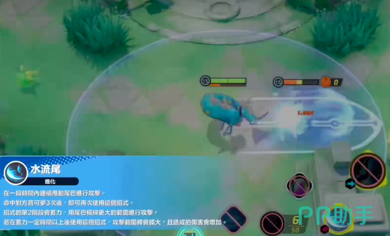 进化后的第二大技能招式是水流伟在一段时间内该角色可通过甩动尾巴对敌方宝可梦进行连续性攻击,命中对方宝可梦三次之后即可再次使用该招式,而且在这个招式的第二阶段会出现蓄力。用尾巴横扫更大的范围进行攻击,若是在蓄力一定时间以上后使用该招式攻击范围会大幅扩大,且对敌方的伤害值也会高效增加,能够达到比较理想化的效果。