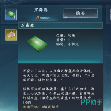 小伙伴们购买这个万毒卷的话,是需要花费50000铜币的,前期资金不够的情况下,还是推荐大家优先完成游戏中的主线任务,而这个功法其实比较推荐一下中的治疗类职业去进行获取的,算是百蛮入门心法之一了!