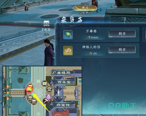 在主世界地图中,前往【蜀王府】,在门口可以找到一个商人,玩家们可以跟商人进行对话,然后就可以购买这个“万毒卷”了,因为是初级的,所以比较容易获得,大家在前往【都城】的时候,可以前往谭松西湖位置去开启传送点!坐标在(X:-1364 Y:70 Z:213);