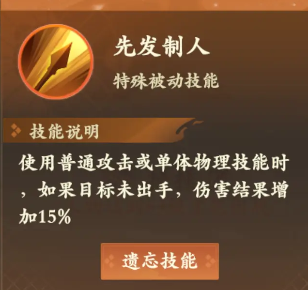 先发制人:使用普通攻击和单体类的无礼攻击技能进行攻击时,如果敌人没有进行攻击,那么伤害会增加15%,那么这个技能就比较适合先手轮次的时候,去进行使用,这样可以获得高额的伤害收益!