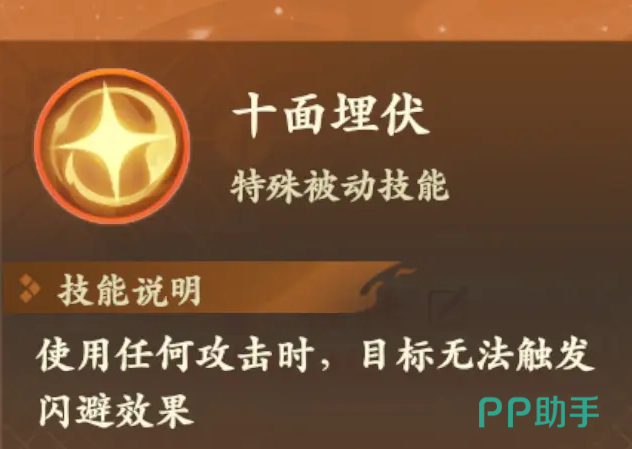 十面埋伏:使用技能的时候,敌人是没有办法进行闪避的,那么就意味着后续的任何技能都是可以百分百触发的,在对于一些带有两个辅助类的阵容时,那么搭配上这个精灵是非常好用的!