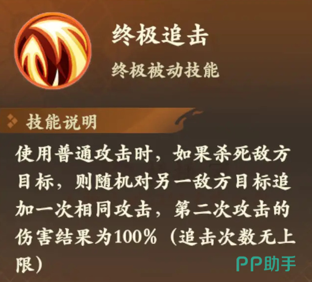 终极追击:在使用普通攻击的时候,如果成功的杀掉了敌人,那么就可以激活追击效果,对附近的敌人再一次发起攻击伤害,而且这个追击次数是没有上线的,并且每一次追击的攻击伤害都是100%的伤害加成转化!这个技能非常的强势,大家在实战中可以搭配其他的技能一起来进行使用!
