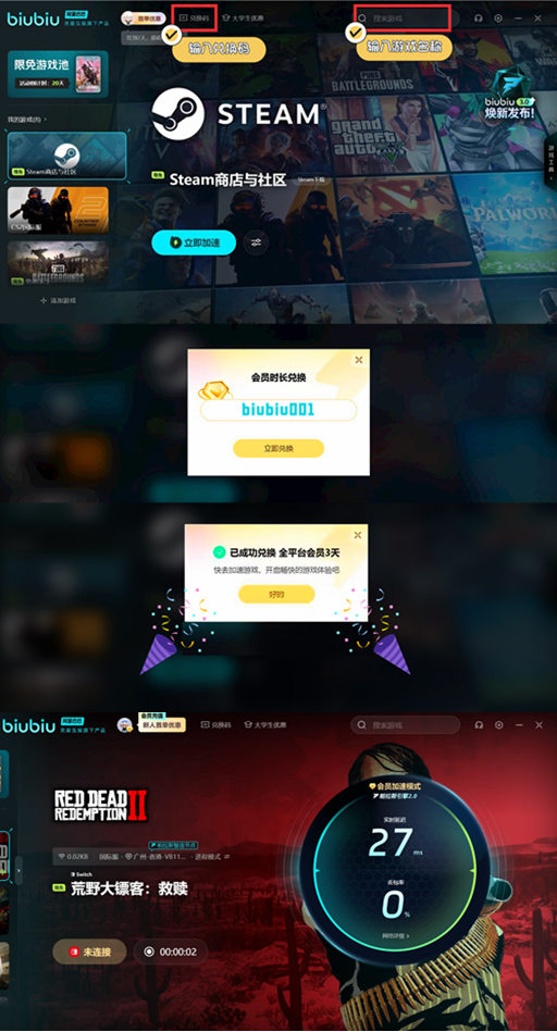 在这些丰富的游戏内容中,网络环境可是享受游戏过程中非常重要的一个因素。除了前文提到的下载方面,我们还可能遇到卡顿、卡加载等问题。此时一款优质的加速器就显得尤为重要,这里小编推荐biubiu加速器,对于新用户注册能获得24小时,新老用户还能领取而输入兑换码biubiu001,更能额外获得72小时的免费加速时长,合计96小时的免费加速时长,帮助你丝滑感受荒野大镖客救赎的每一个精彩瞬间!