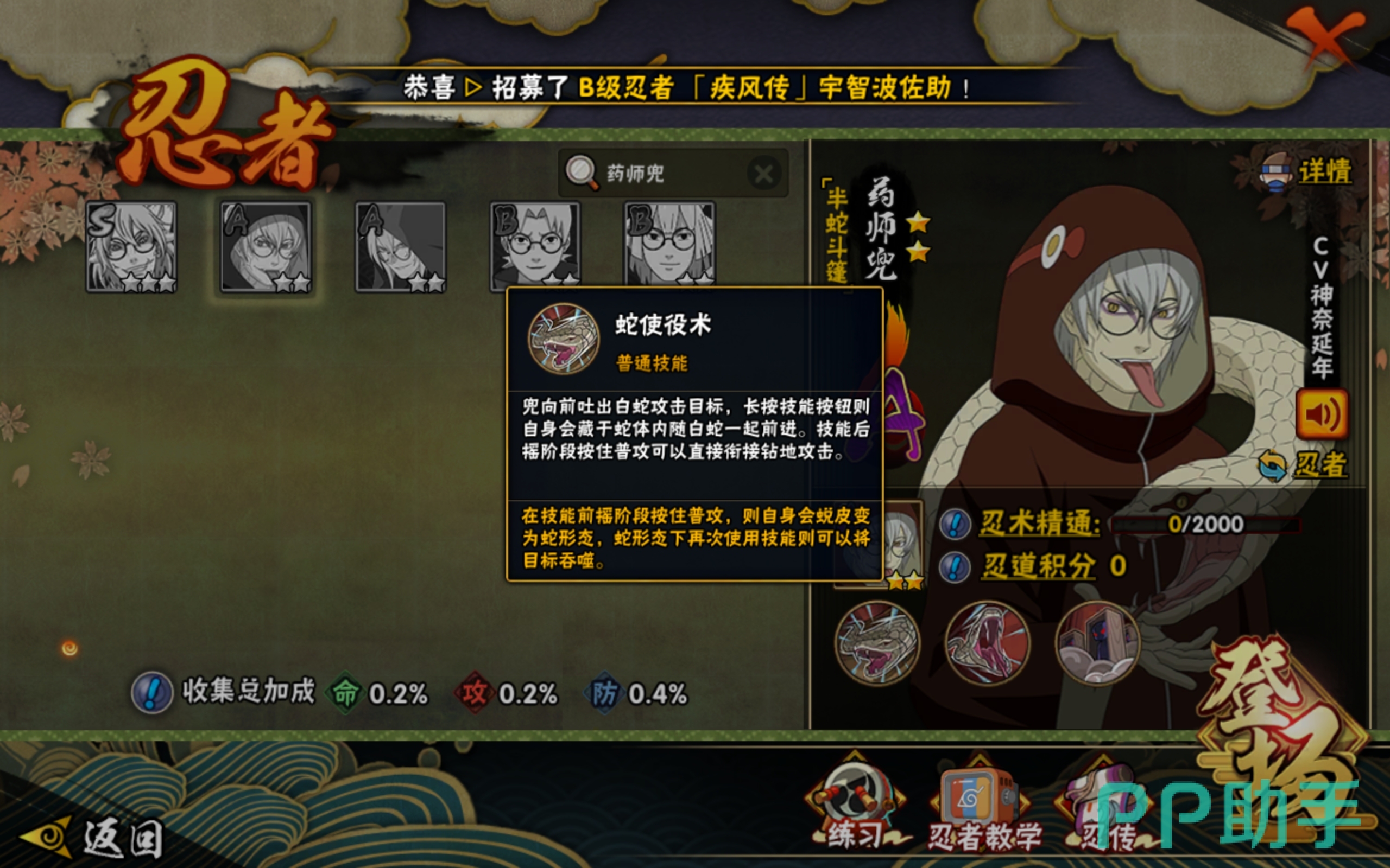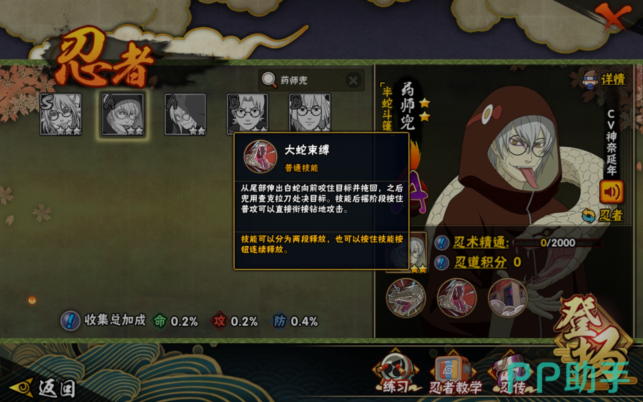 制作团队采用了最新的引擎和技术去打造这个游戏,并且将原著内的场景,以3D建模的形式复刻了出来,让大家可以置身于忍者的世界内,药师兜是游戏内的一个英雄,有多个形态,那么火影忍者手游药师兜半蛇斗篷怎么样呢?按照游戏内的分类,这个角色属于A级忍者,拥有很高的战力,操作起来也很舒服,还附带着多个实用技能,整体的战斗力很强。