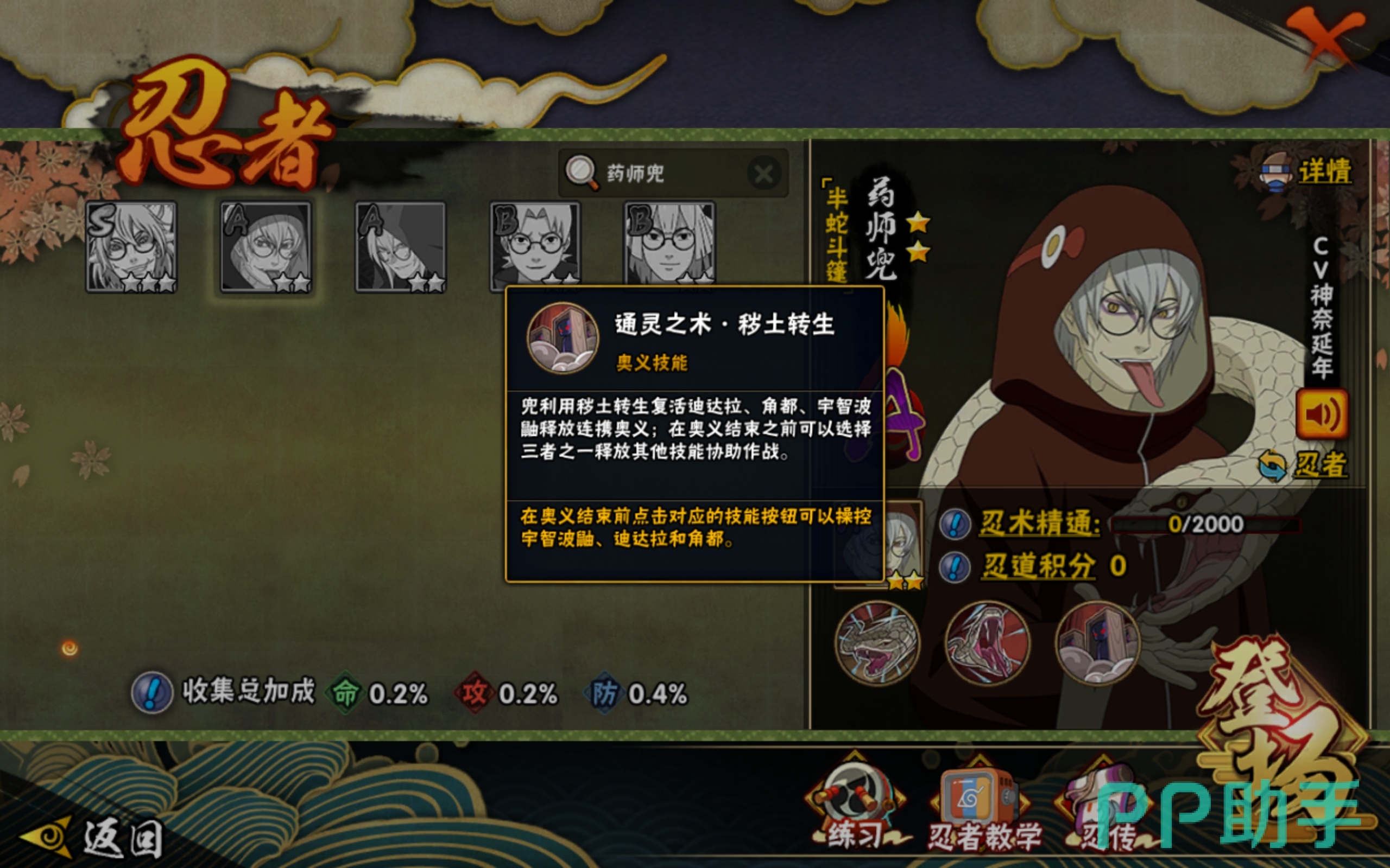 通灵之术・秽土转生这个奥义大招可以利用秽土转生复活角都、迪达拉、宇智波鼬,然后释放连携奥义。在奥义结束之后可以选择三者之一,接着就能用对应角色的技能去协助作战。选择宇智波鼬会释放豪火球术;选择角都则是补足缺少的伤害;选择迪达拉会释放绒毯轰炸和起爆黏土・枭,可在空大时保护自己。至于要选择哪一个角色去辅助对抗,就要看当时的战况以及对手的实力了。