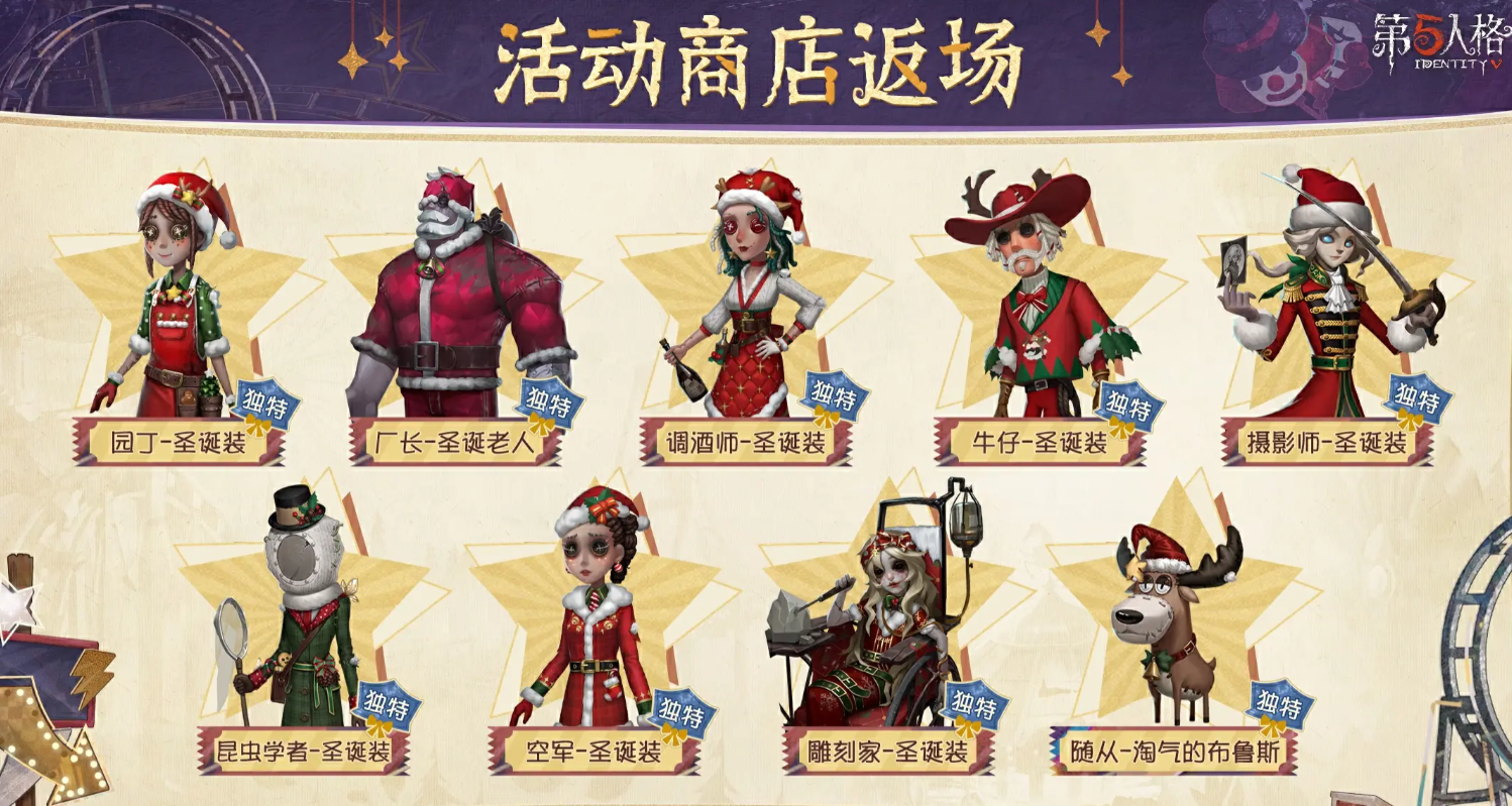 以上就是第五人格圣诞节活动前瞻的分享,本次活动不仅有新时装、地图和玩法,还将上线各种以前活动中的圣诞装,期待的小伙伴们可以耐心等待一波,相信到活动期间,大家都能在游戏中渡过一个快乐的圣诞节。