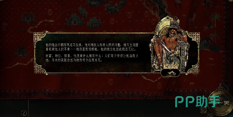 首先就是苏丹,游戏中的主角,是一个中世界帝国的统治者,睿智强悍同时也很疯狂、残忍。