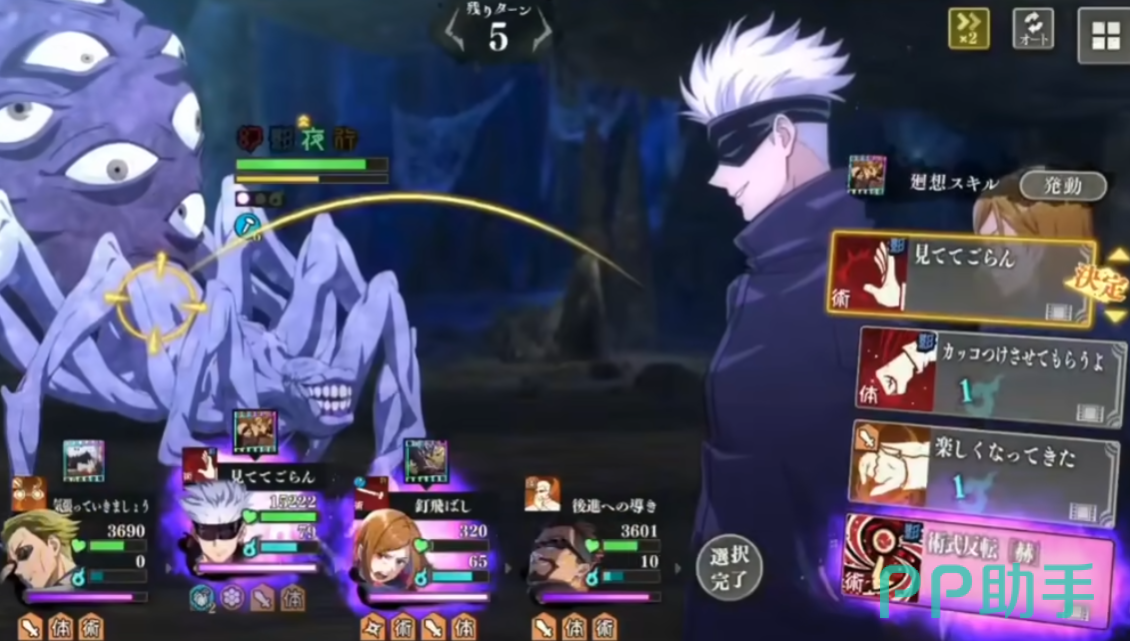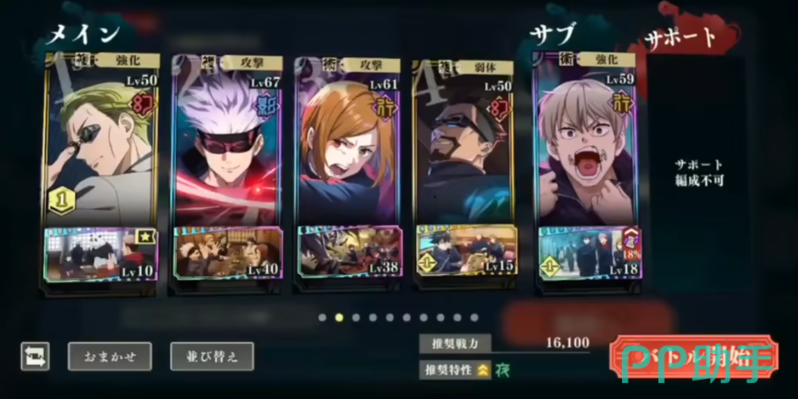 五条悟的配队大家只要记住一个要点即可,那就是两个输出两个辅助,因为五条悟本身就有着爆炸性的伤害,但是会在七个回合后就退回,所以我们只需要再补一个输出位再配以两个辅助让五条悟的伤害更加爆炸即可。