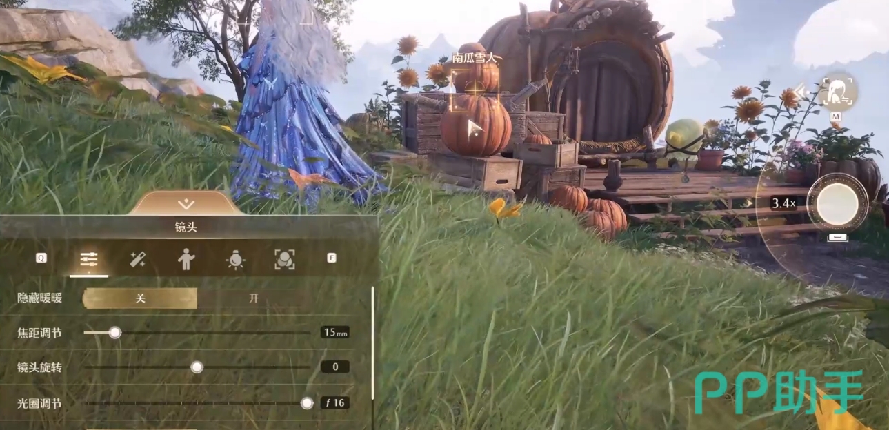 对话结束后,玩家们可不需移动直接呼出拍摄界面,然后将视角转向小屋处,它附近的两个南瓜就是本次错位拍摄的目标,只要玩家们调整镜头高低和拍摄角度,就能令这两个南瓜在视觉效果上形成类似雪人的模样,然后只需将它们的样子记录下来即可。