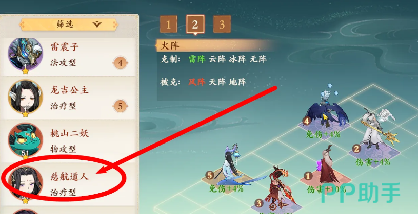 慈航道人:在游戏中是一个很出色的治疗型角色,拥有坚韧的生存能力,还有控制手段,可以给队友带来额外的增益效果。在各个战斗的场景中都会有对应的作用,就算面临高难度的战斗治疗的效果都可以给队伍带来支持。