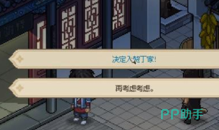 在声望达到4级以上后可以与丁员外对话,询问入赘有哪些好处,然后就可以离开丁家了,之后在当天子时之前回到丁家就可以出发决定入赘丁家的事件,答应入赘后,玩家可以在丁家大院中举办婚礼,婚礼结束之后就是成功入赘丁家,之后玩家每天都能够获得一贯铜钱,并且可以在丁小姐的住处睡觉,每个白天与丁小姐对话都可以获得金钱和食物的奖励,入赘之后的好处还是非常多的。