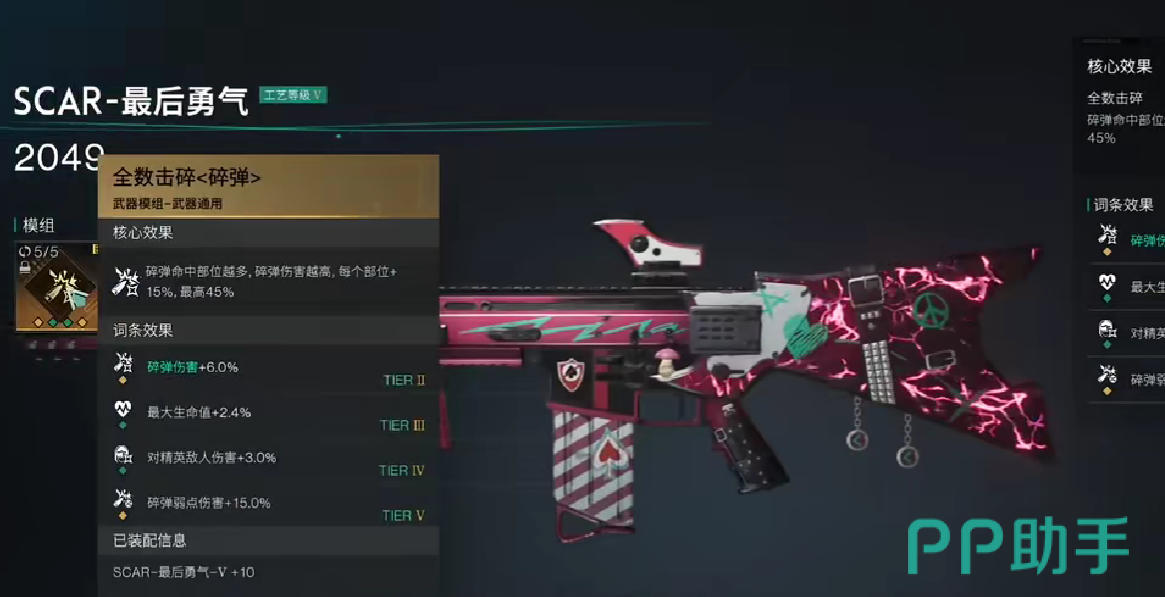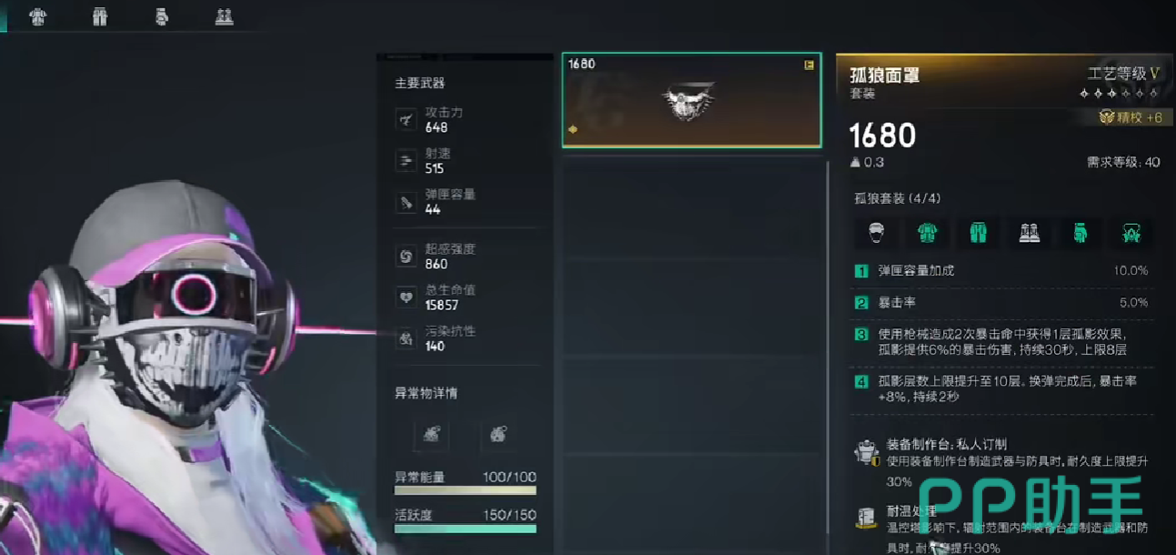 在防御物品的选择上面,建议玩家使用贝雷帽,贝雷帽可以增加碎弹的命中概率,并且搭配最后的勇气枪械特性,还能够打出连续碎弹效果,但是贝雷帽只适用于boss对战,如果玩家想要增加自己在pvp当中的胜率,也可以切换成为防毒头盔或者是牢笼头盔,牢笼头盔可以增加命中率,而防毒头盔可以极大程度的提高玩家的站场能力。