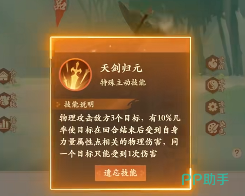 天剑归元:这是蛙灵的特殊主动技能,能够物理攻击敌方三个目标,并有10%的概率使目标在回合结束后受到与自身力量属性点相关的物理伤害。这一技能不仅拥有高额的群体伤害,还附带一定的反噬效果,使得敌人在面对蛙灵时不得不谨慎行事。随着蛙灵的觉醒,该技能的伤害和触发概率还会进一步提升。