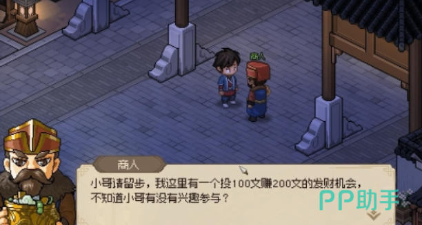 通过商人想要快速的赚到钱,可以采用存档与读档的刷钱方式,投资之后等待12个时辰,可以选择先存档,然后通过读取存档反复在与商人交谈,以此来实现刷钱的效果,在交谈中还有一个选项是我对钱没有兴趣,等待12个时辰后再找到商人,有机会触发游戏中的一个漏洞,可以使用10贯钱来获得高额回报的投资,这个方式也是可以通过存档和读档的方式来回刷的,这样既提高了投资的回报率,也降低了风险。