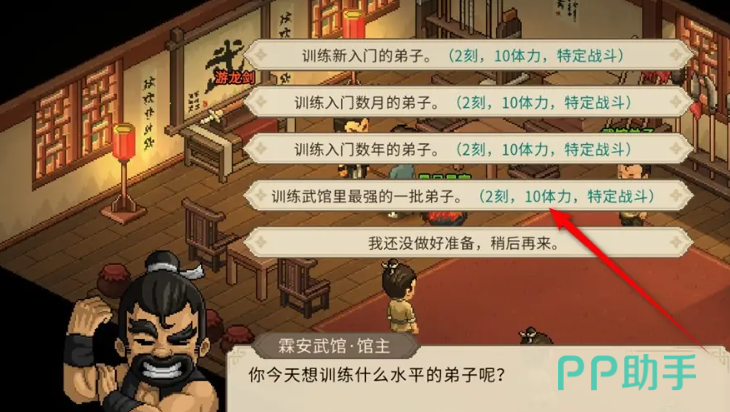 在霖安城中还可以在武馆中打工来获得赚取金钱的方式,首先前往武馆中与馆主对战,直到战胜馆主的十成功力,就会多一个赚钱选项,可以选择训练弟子的强度来获得不同水平的金钱,每一场战斗消耗的时间和体力是一样的,玩家可以先从最初始的来训练直到训练到最强的,一天可以训练四次,这也是一个赚取金钱的方式。