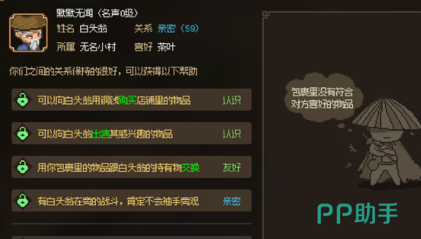 在无名小村中,新手玩家刚进入的时候可以遇到一个老头,可以选择无视或者拜师,无视之后就没有后续的剧情了,拜师可以选择宗门,无双宗、天道帮和保国会三个,每个门派都有不一样的特性,玩家可以根据自己的需求来选择,小村中间有一个白头翁在摆摊,可以通过帮助白头翁完成心愿的方式,来邀请白头翁加入队伍,就有一个有医疗属性的强力队友了。