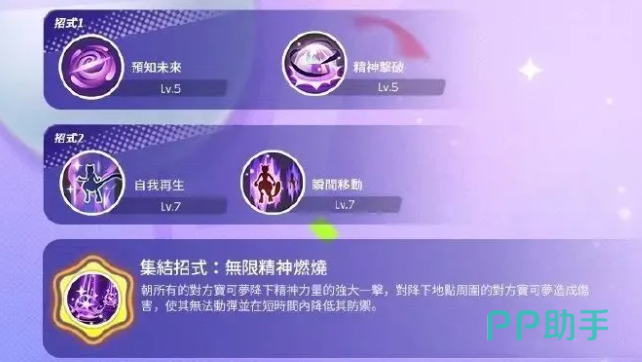 超梦y是一个远程输出,最主要的技能就是预知未来和瞬间移动,在游戏的前期,小编比较推荐玩家们选择这两个技能进行搭配。预知未来这个技能可以使得超梦y向前方发射出一道光波,并且对敌人造成攻击,而瞬间移动顾名思义就是在施展之后可以让超梦y移动到指定的地点。此技能无论是用来躲避敌人的攻击还是追击敌人都是相当好用的,这两个技能配合使用更是可以进一步的提高超梦y的生存能力和追击能力。