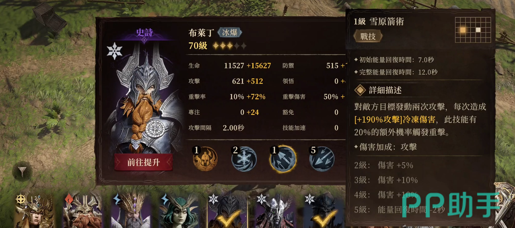 布莱丁是主要输出冰爆英雄,他的战技雪原箭术,对单体的敌方目标发动两次距离为三格的箭术攻击,每次都会造成冰冻伤害,而且有20%的额外几率触发重击。