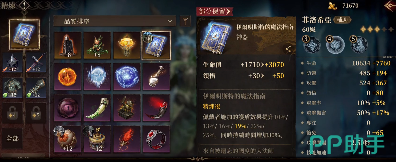 这队伍有三个冰爆属性英雄作为主输出,还有一位金色传说稀有度的冰属性辅助菲洛希亚,给队伍提供护盾作用。同时菲洛希亚还需要带伊尔明斯特魔法指南神器,让佩戴者施加的护盾效果增加10%~25%,持续时间增加30%,除了提升护盾之外,领悟属性还有持续时间,给整个冰爆队带来更高的生存收益。