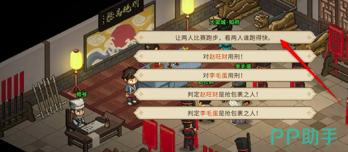而随着对话的发生,玩家可触发一道选择性问题,此时玩家需要面临五个选项,建议玩家要选择第一个选项“让两人比赛跑步,看两人谁跑得快”,这个选项才能够触发后期的故事剧情内容,而在比赛结束后就可以查明犯人的真身,此时嫌犯已经暴露无遗。