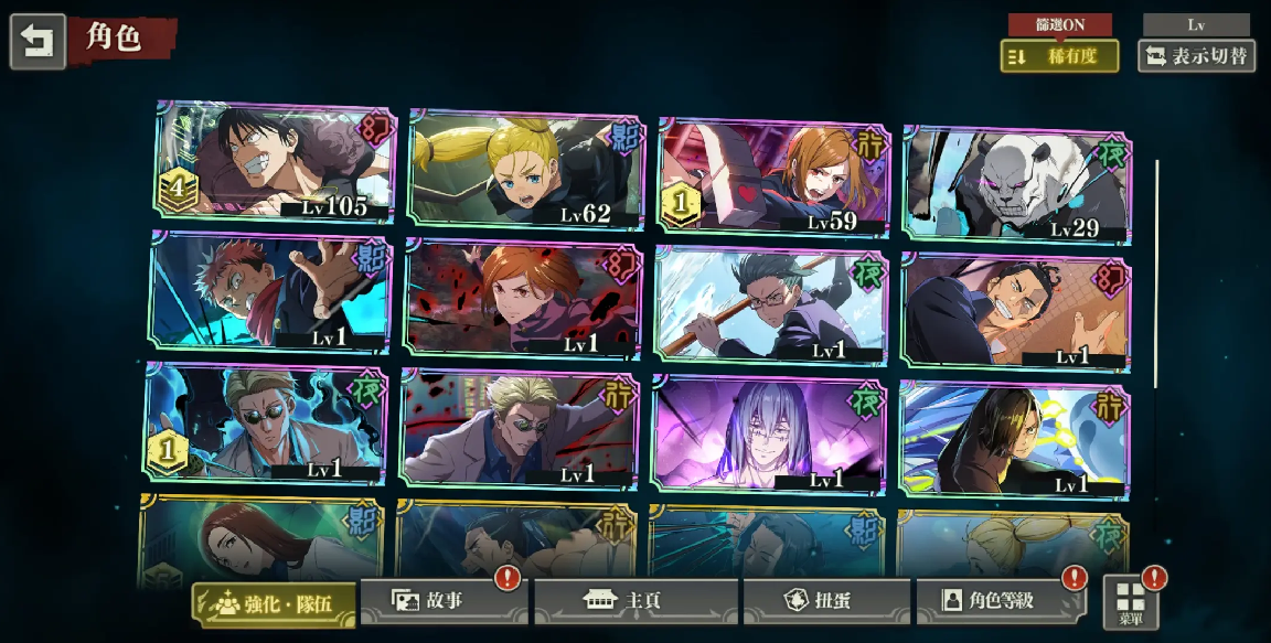 3、输出推荐:输出位置可以选择的就比较多了,不过在日常图和推剧情中不算属性克制的情况下,小编个人是比较推荐是3号位【不完全的领域】伏黑惠和4号位【把力量借给我】乙骨忧太。这两个角色用2技能aoe能够做到快速清场,起到快速刷图的作用,前期开荒是非常好用的。如果没有他俩的话,也可以使用其下位替代品,比如【炮咒强化形态】究极机械丸和【大义】夏油杰,这两个觉得AOE输出能力也是比较足的。