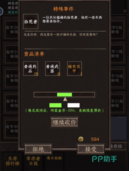 游戏包含有模拟、经营、对抗、求生、策略等丰富的内容。超市就是玩家的生存基地,通过售卖货物可以让自己得到所需要的材料,以此来进行更好的升级提升。在进行买卖的同时,也一定要提升自己的防御实力,不仅要有充足的食物,更要有药品和武器装备等。