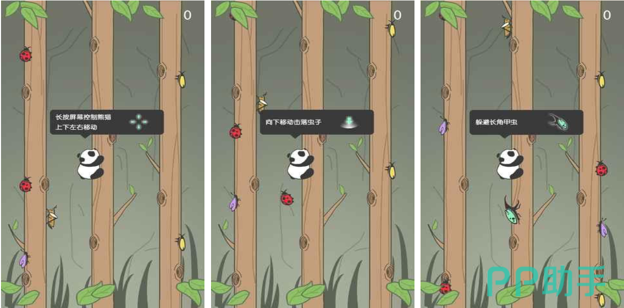熊猫爬树这款游戏是根据经典诺基亚自带小游戏改编的,主角是一个憨态可掬且行动敏捷的熊猫,可以在三棵树之间自由跳跃躲避虫子的攻击,也可以控制熊猫向下滑动将虫子击落,简单好玩的操作也锻炼了玩家们的反应速度,卡通的美术UI搭配呆萌的熊猫和昆虫也给大家带来了视觉享受。
