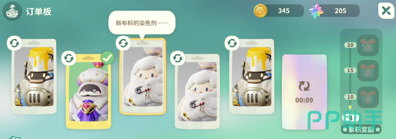所以大家想要完成订单的话,可以先打开订单版。看一下当前有什么订单可以做,例如一只小绵羊说自己需要新布料的染色剂。这时候你给予他一定数量的染色剂后,就可完成订单。