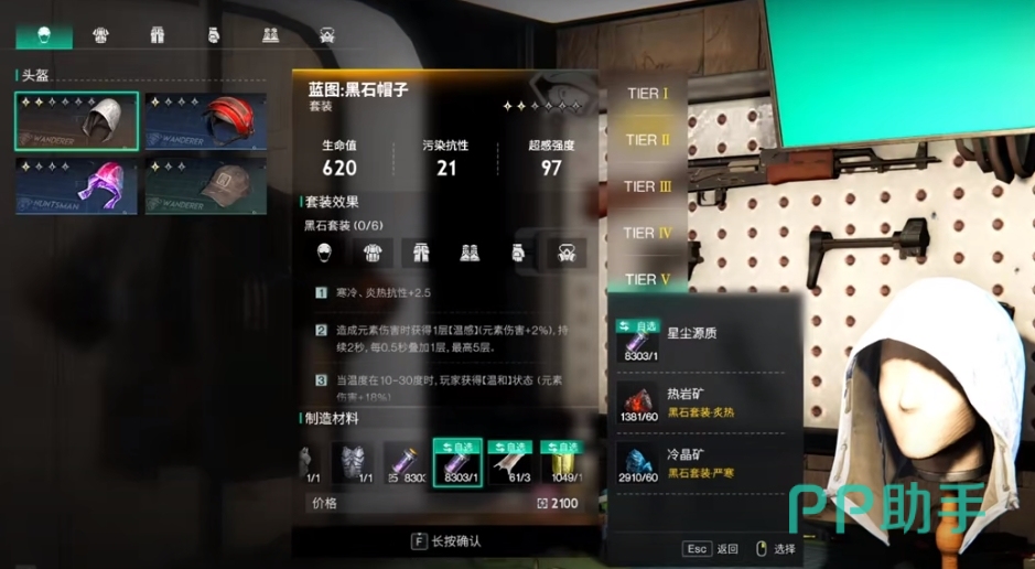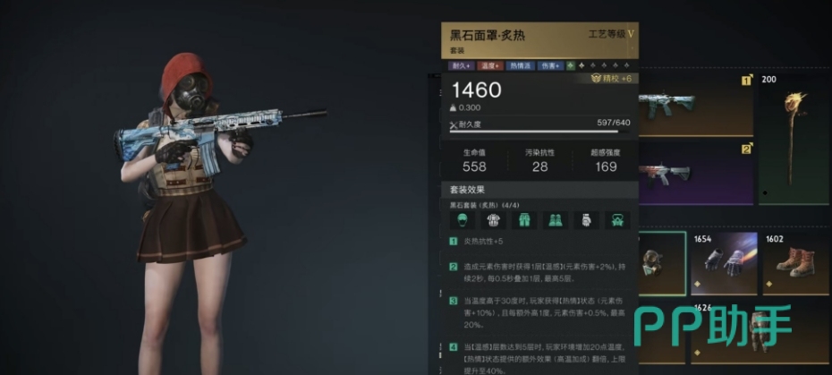 在新的地图环境上,玩家要想要保持身体的恒温,首先就是要解决衣服、帽子和面罩的问题,适合极度寒冷和炎热环境的服饰建议选择黑石套。