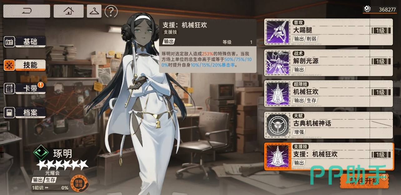 支援技为机械狂欢,可依据自身攻击力对选定目标造成特殊伤害,当场上友方单位的总生命高于不同百分比时,更是能进一步提升自身的暴击率。