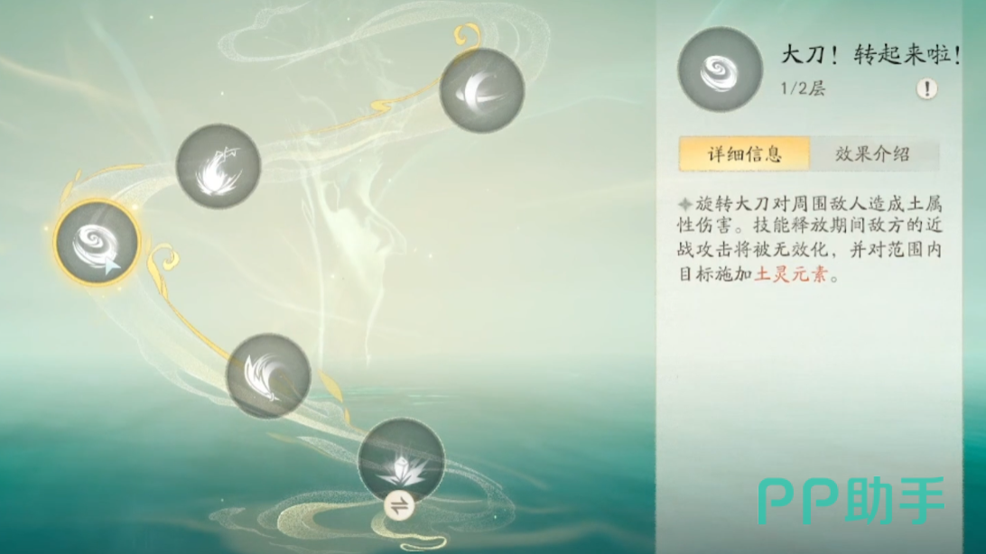 该角色的二技能是大刀转起来啦,可把自身的大刀来进行旋转攻击,更是能针对范围内的敌人带来强力的土属性伤害,同时也会给敌人施加土灵元素,在该技能的释放期间,所有范围内的敌人近战攻击都能够视为无效化。