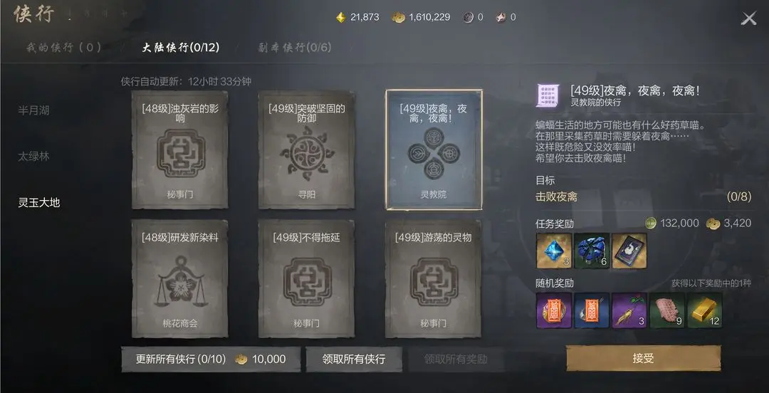 第三个是探险的玩法,在探险里面时根据角色等级的替身,还有主线任务逐步推进的,人物流程相对来说会复杂一些,所以任务提示搞清楚了再去做;最后就是侠行的任务,通俗来说是每日任务,每天可以完成12次。