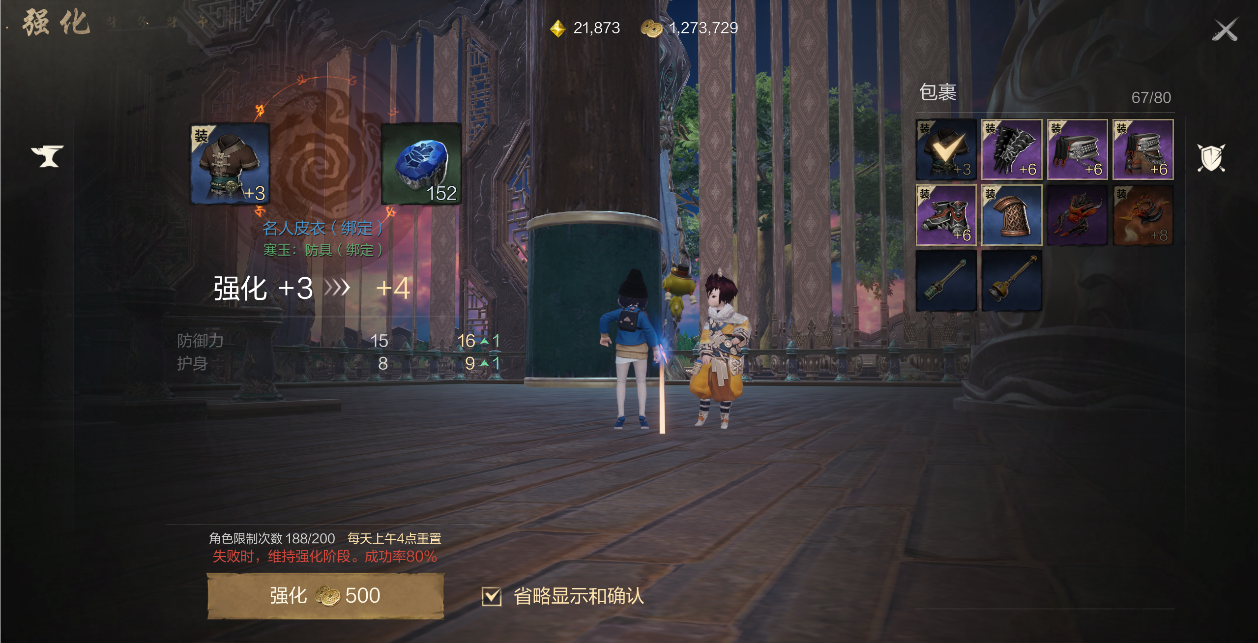 而装备是有稀有度和品质的区分的,最普通的是绿装,蓝装稍微强一些,紫装是稀有级别,橙装则是至尊级别的,所以至尊以下的装备基本是用来过渡的。那么前期过渡的装备最好强化到3就可以了,适当的提升这些装备的属性,提升战力的同时不会造成强化石的浪费。
