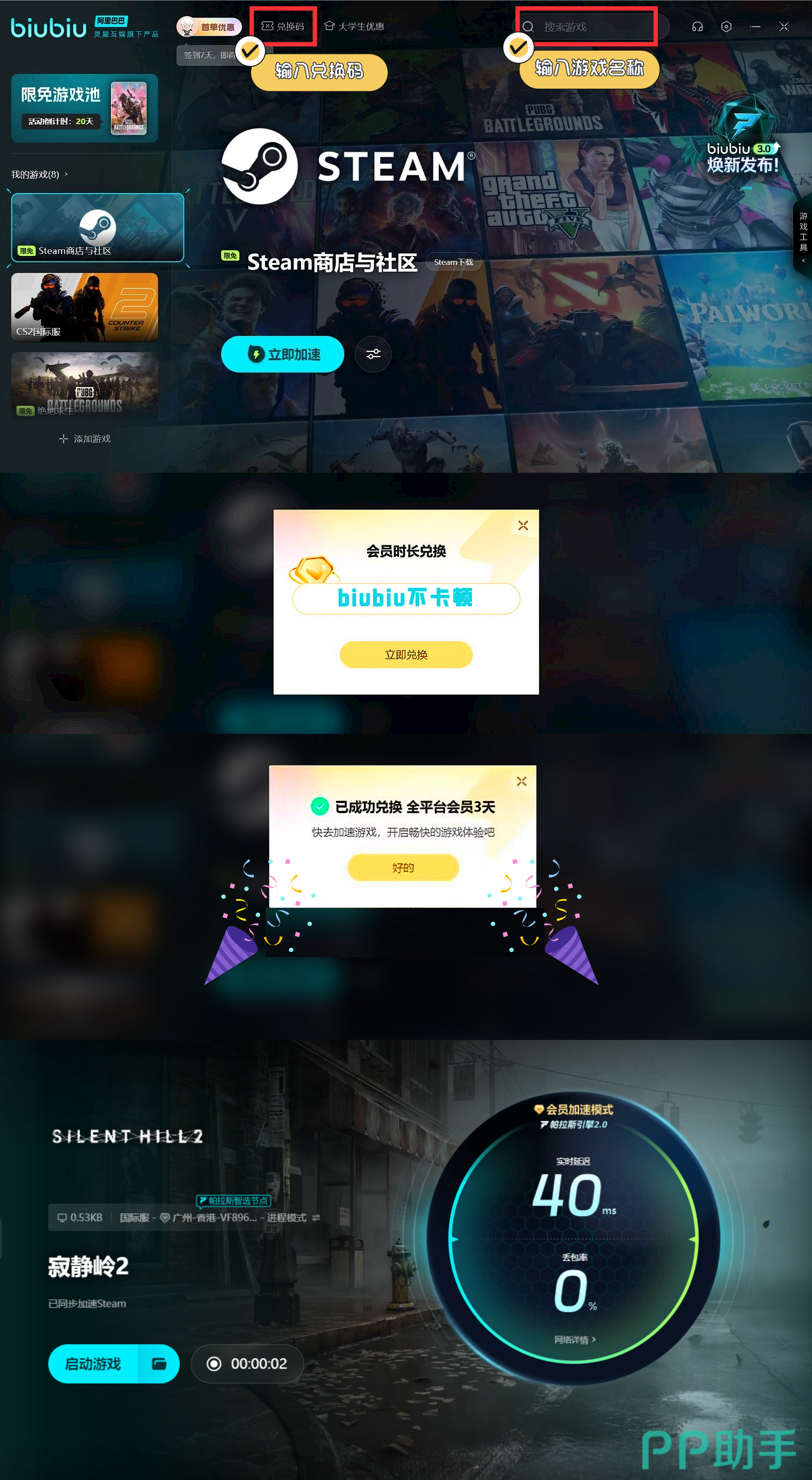 现在biubiu给新用户免费试用24小时的,另外兑换码【biubiu不卡顿】新老用户都能拿去换取额外的72小时加速时长,新人可以用96小时了。